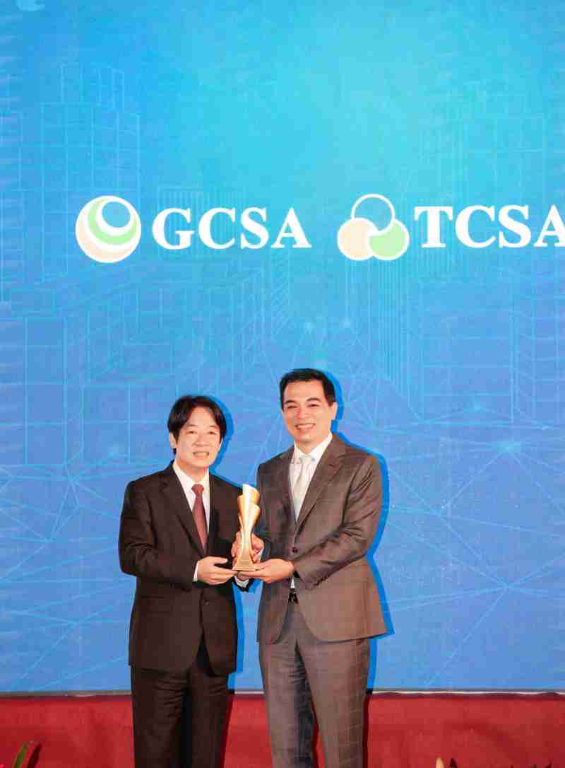 达全方位永续表现获全球永续奖及台湾永续奖肯定,,,由副总统赖清德颁奖 (左),,,,尊龙集团总经理柯富仁 (右) 代表领奖