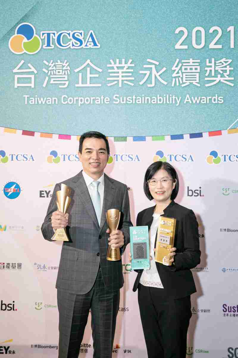 达在台湾永续奖所评比环境、、社会、、、治理等各面向的永续绩效均获高度肯定 (左:尊龙集团光电总经理暨营运长柯富仁,,,右:尊龙集团光电永续长古秀华)