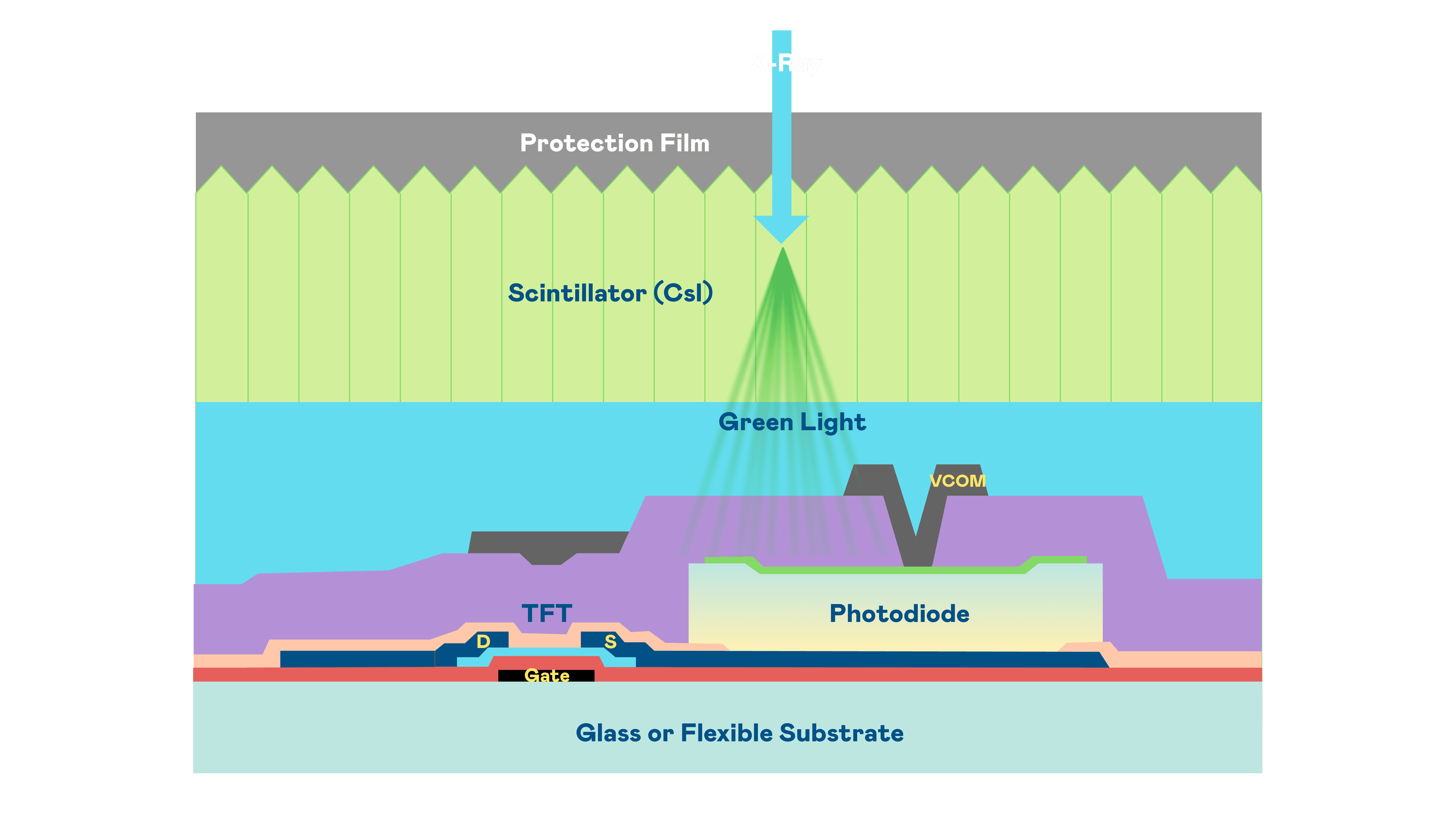 尊龙集团的X光影像感测阵列使用薄膜电晶体 (TFT) 作为每个像素的读取开关,,搭配光电二极体(Photodiode)的光电转换元件,,,,用以感测X光影像讯号。。。。